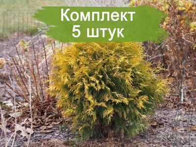 В комплект входит 5 саженцев туи 'Глобоза Ауреа'. Растения упакованы таким образом, чтобы обеспечить их безопасность и сохранность во время транспортировки.